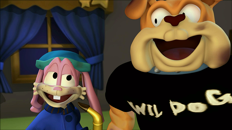 A rabbit is playing the saxophone late at night in his apartment. A bulldog, who was playing the tambourine next door, bursts in complaining about the noise. This bold 3D slapstick comedy features many adorable characters.